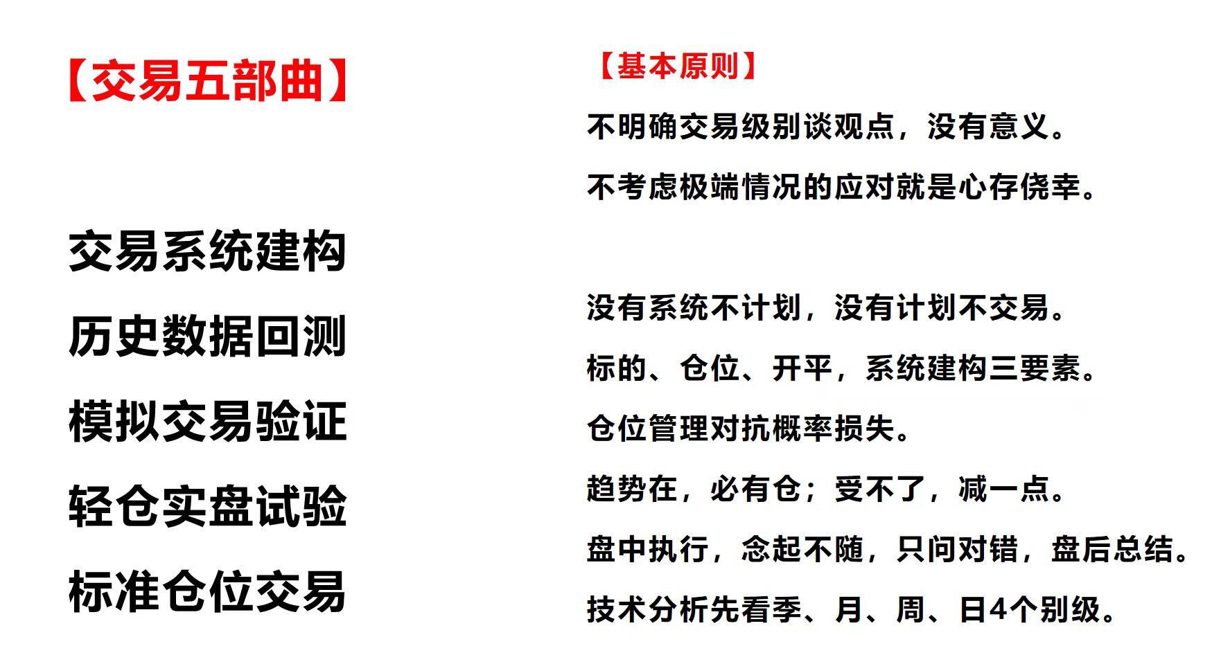 我们主张系统化交易,梳理了交易五部曲和几点原则,简单说一下,供诸位参考。这些内容明确带有个人主观色彩的,不与任何人争辩,仅供诸位参考。我们坚持“我为市场立法”。